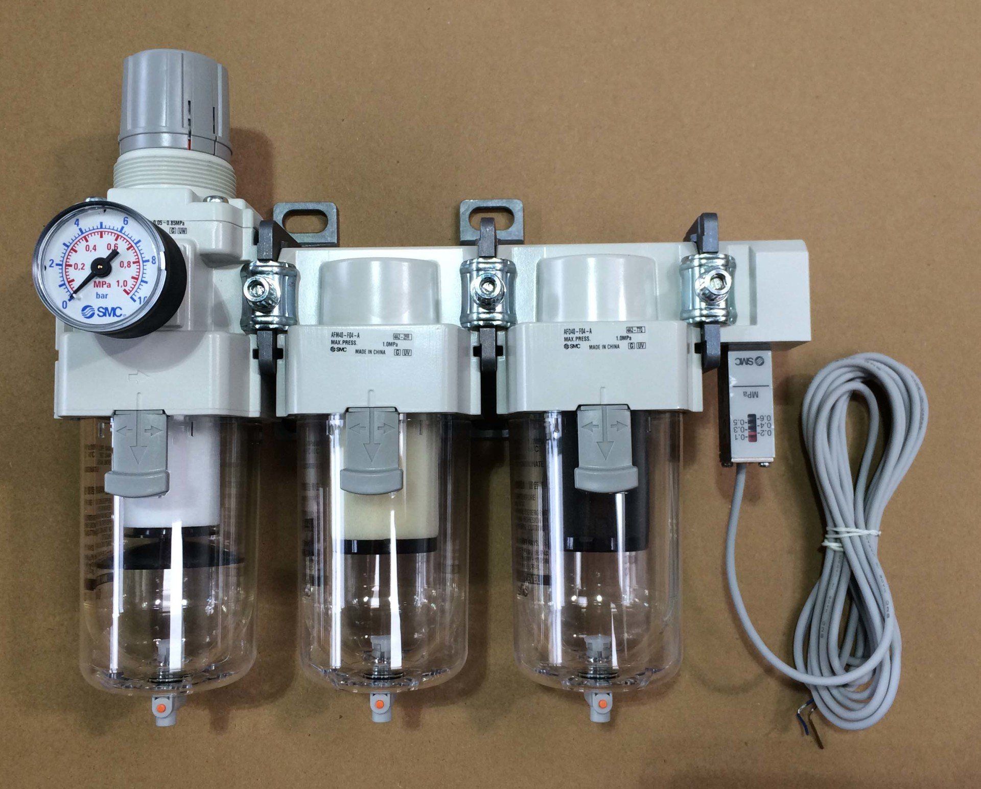 Eine Wartungseinheit kann eine Kombination aus einem Filter und einem Druckregler in einem Gehäuse sein, oder aus mehreren Modulen bestehen.